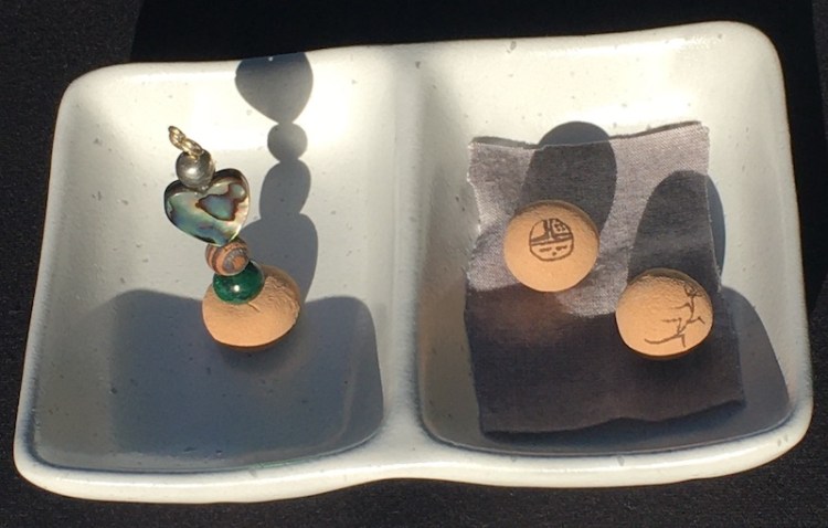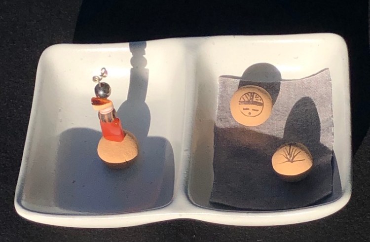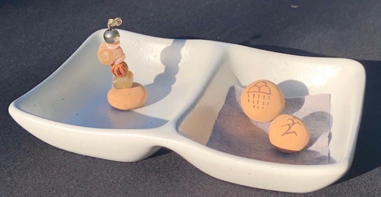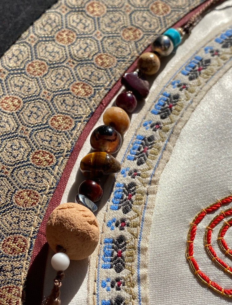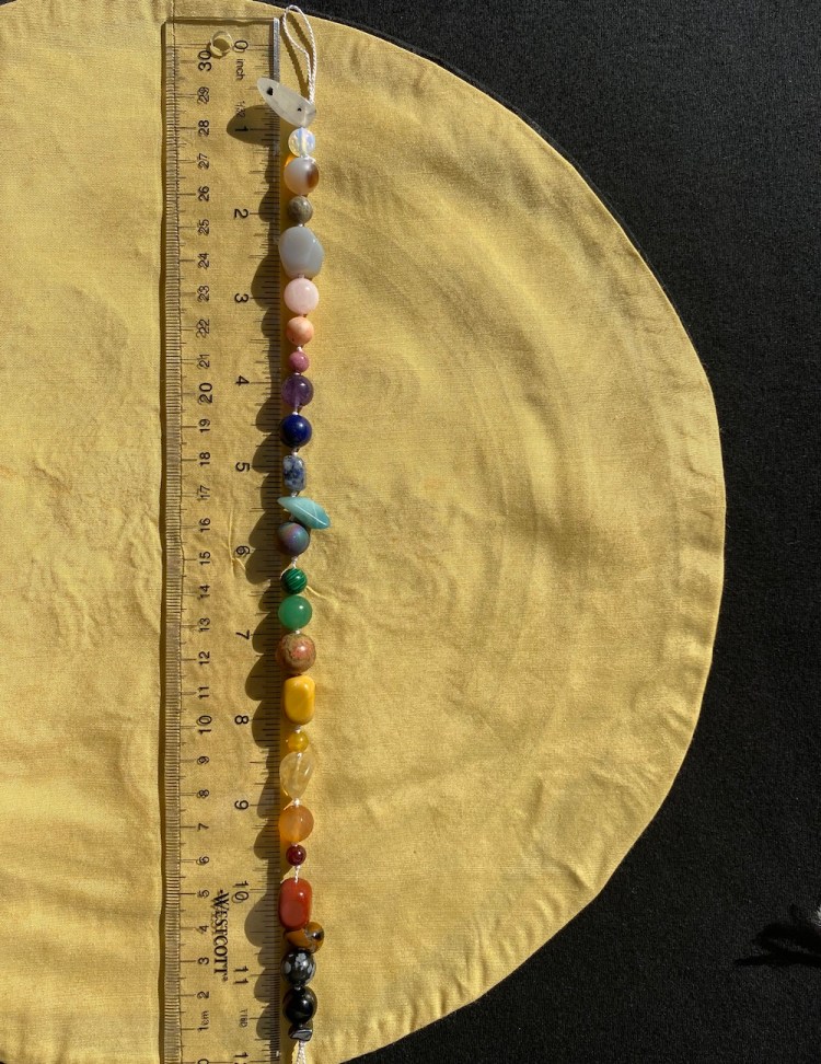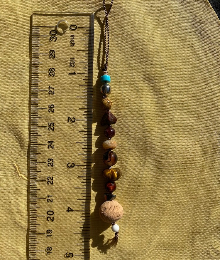 Thirteen types of stones, crystals, shells, and beads comprise the Sacred Earth NDNS Prayer Totem and feature four elements important to indigenous people. The top three elements come from Native American necklaces owned by my Grammy Amelita of Jemez Pueblo. The penultimate element is our symbolic NDNS Hemish Healing Earth Pottery Bead made from sand and clay of our ancestral lands.