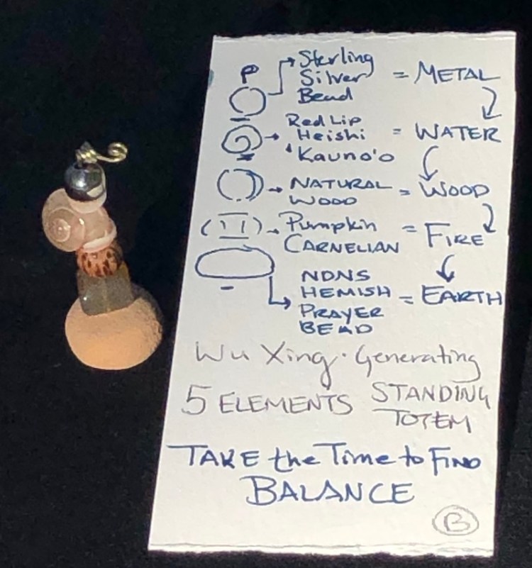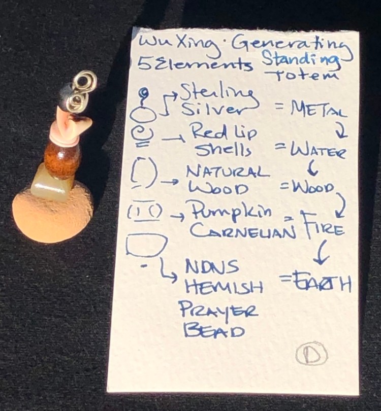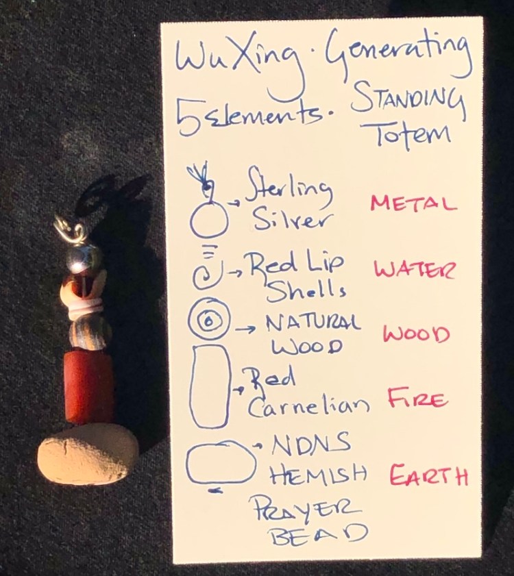 The NDNS Wu Xing Warrior Totem honors the 5 Elements or Phases of Chi in the Generating Formation. Metal (when heated then cooled) generates water (condensation). Water produces wood. Wood feeds Fire. Fire produces earth. Earth Generates metal (mined minerals). I have a particular affinity to the Wu Xing philosophy that I attribute to my lineage. My mother is Native American from Jemez Pueblo, and my father immigrated from Southern China. The Wu Xing philosophy is from China, yet the NDNS Hemish Prayer Bead made the entire Wu Xing Totem fulfill its intent in true East meets West beauty. The NDNS Hemish Prayer Bead consists of sand and clay hand-harvested from our ancestral lands of the Hemish (Spanish translated as Jemez) Nation and formed by hand. As the pottery beads were placed in the kiln to be fired, prayers for the bearer’s health and healing were spoken in our Native language. May your energies be protective and productive. May you attain and maintain Balance.